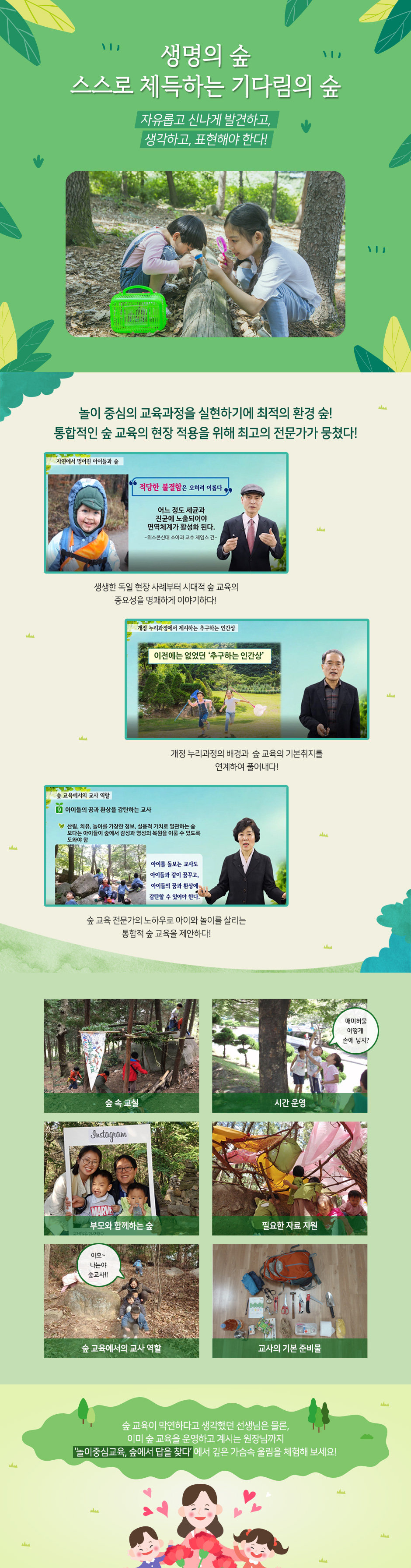 개정 누리과정의 기본 취지는 유아가 중심이 되고, 놀이가 살아나는 교육과정을 실천하는 것으로, 놀이와 학습이 유아에게 의미 있는 방식으로 일어나도록 하는 통합적인 접근 방식이다. 놀이 중심의 교육과정을 실현하기에 최적의 환경인 숲에서의 교육에 많은 관심이 생기고 있고 실제 숲 교육을 통한 긍정적인 결과들이 도출되고 있다. 이에 보육교사들이 숲 교육에 대한 기본 취지와 개념을 이해하고, 통합적인 숲 교육을 계획하여 적용하는 것을 목표로 하고 있다. |